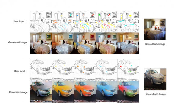 使用草图线条和插入颜色的组合,AI能够生成逼真的最终图像,并自动对图像进行着色,同时从原始部分着色的草图中获取提示。研究人员解释说,用户可以编辑图像并实时查看这些编辑的结果。